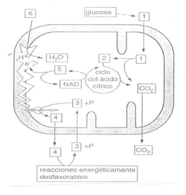 1: Ácido pirúvico, 2: Acetil CoA, 3: ADP, 4: ATP, 5: NADH, 6: Oxígeno