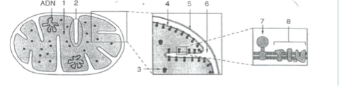 1: Matriz mitocondrial, 2: Crestas mitocondriales, 3: Membrana interna, 4: Membrana externa, 5: Espacio intermembranoso, 6: ATP-sintetasa, 8: Complementos proteicos.
