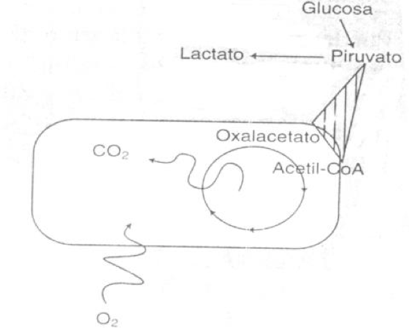 Se distingue la Glucólisis, ya que a partir de la glucosa se obtiene Ácido Pirúvico, la descarboxilación oxidativa, ya que del piruvato obtenemos Acetil-CoA, fermentaciones, ya que a partir del piruvato se obtiene lactato, el Ciclo de Krebs, ya que aparece el ácido oxalacético y el Acetil–CoA.